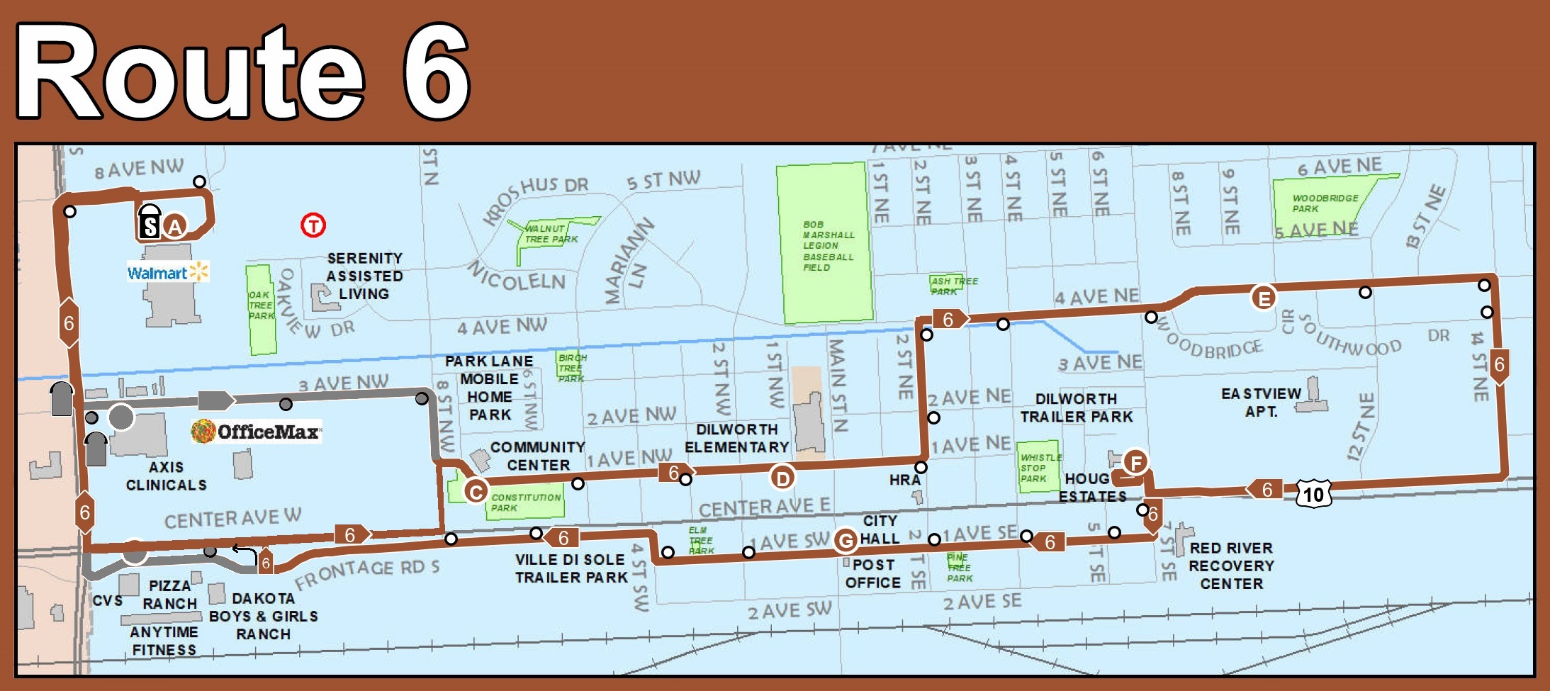 Beginning immediately, Route 6 will have an updated detour due to continued road work on 34th Street in Moorhead between Hwy 10 and 34th St N and the closing of the intersection at 34th St and 3rd Ave N. Route 6 will take Hwy 10 between 34th Street and Co Rd 9.