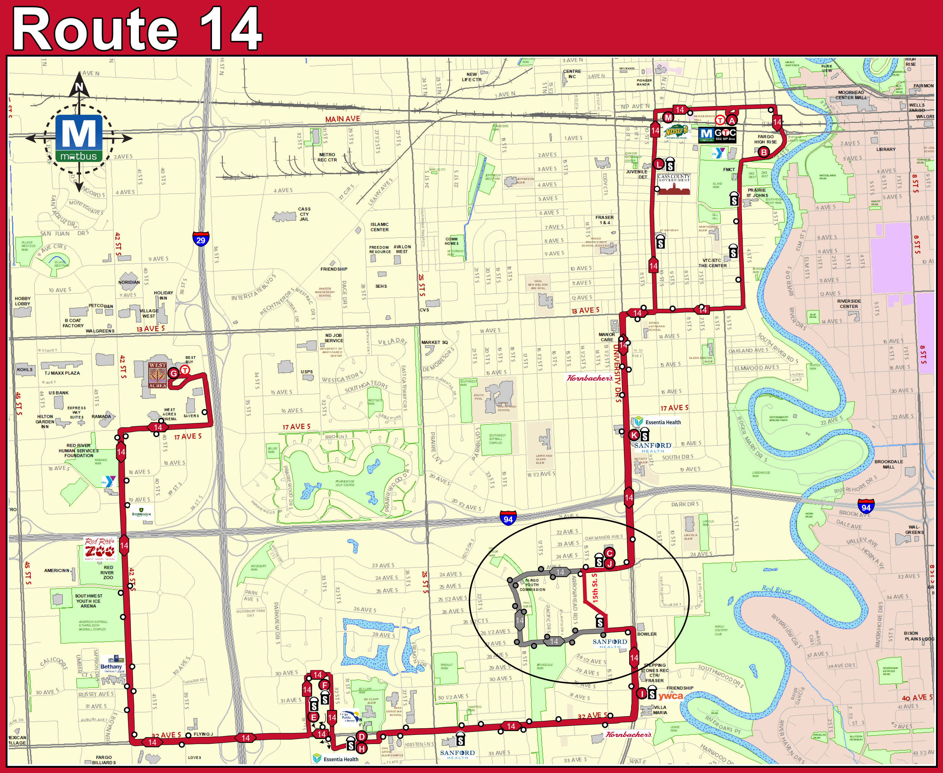 Due to the closure of 25th Ave S between 17th St. S & 18th St. S, Route 14 will be detoured for 2 weeks beginning October 17th.