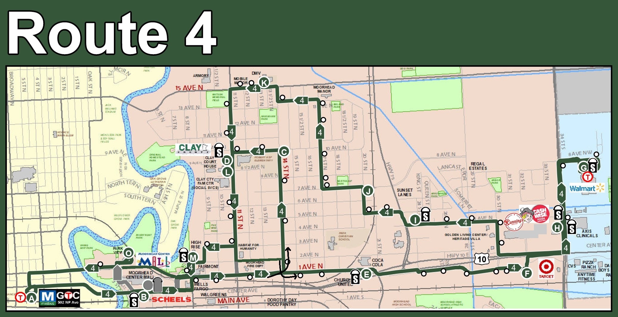 Beginning Thursday, October 30 at 12:00 pm, there will be an update to the Route 4 detour with the opening of 1st Ave N. Route 4 will mostly be back on route, except for the intersection of 1st Ave and 11th St and 3rd St between Center and 1st Ave N. Outbound Route 4 will take 2nd Ave N, instead of 1st Ave N between 11th St and 14th St on its way out to Walmart.