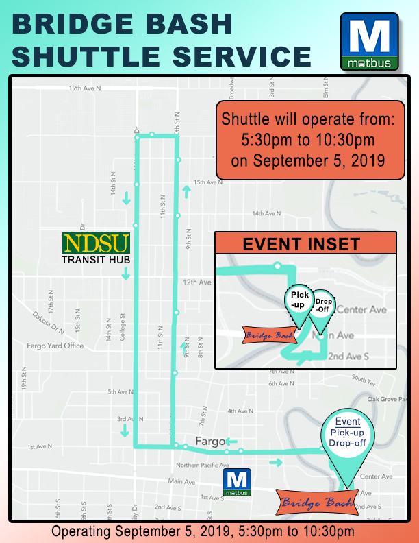 MATBUS will be providing transportation to the general public to assist in reducing traffic and parking issues in downtown Fargo-Moorhead during the Bridge Bash on Thursday, September 5, 2019. A copy of the shuttle route can be found on MATBUS.com or you may call our dispatch line at (701) 232-7500 for more information.