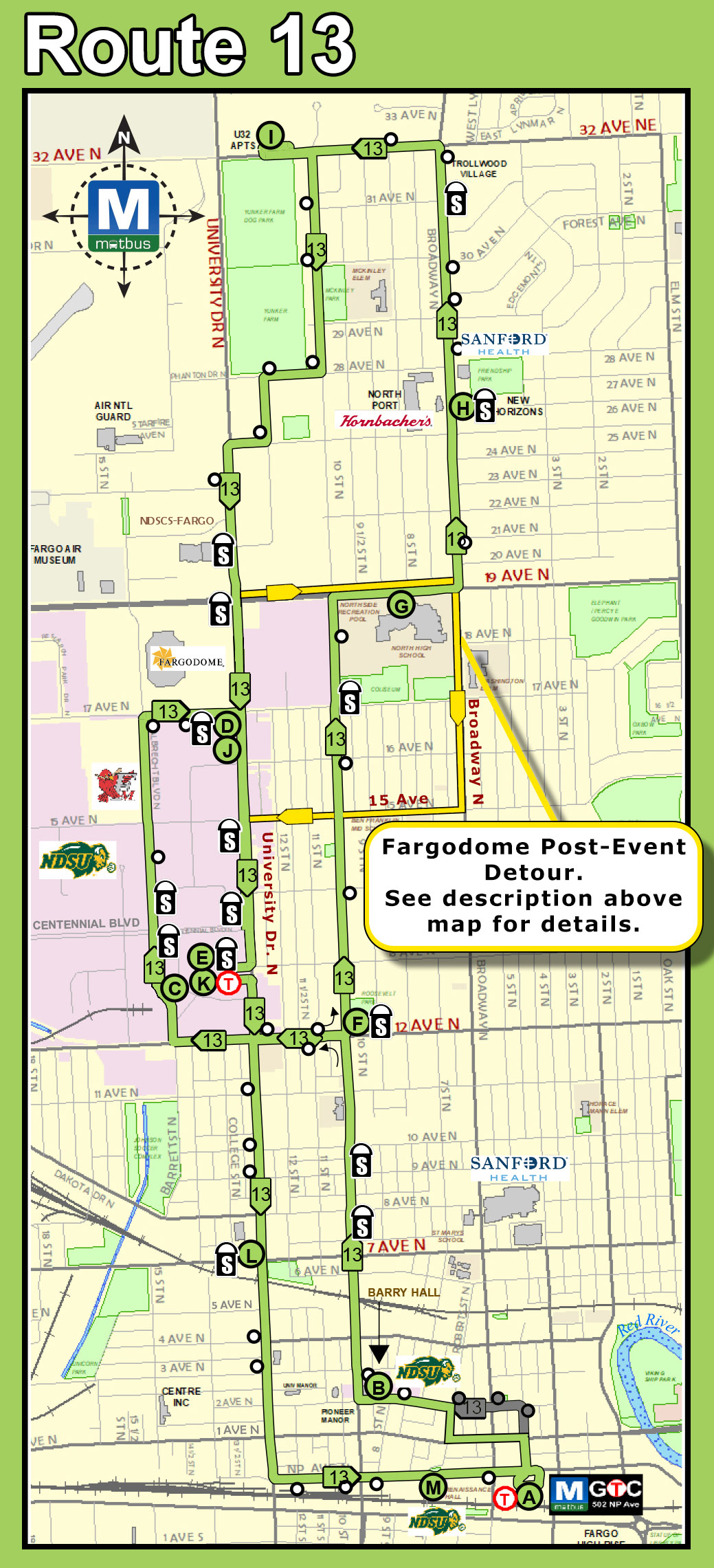 Outbound Detour: Route 13 will turn west onto 1st Ave N, north onto Roberts St., then west onto 2nd Ave N, back on route.