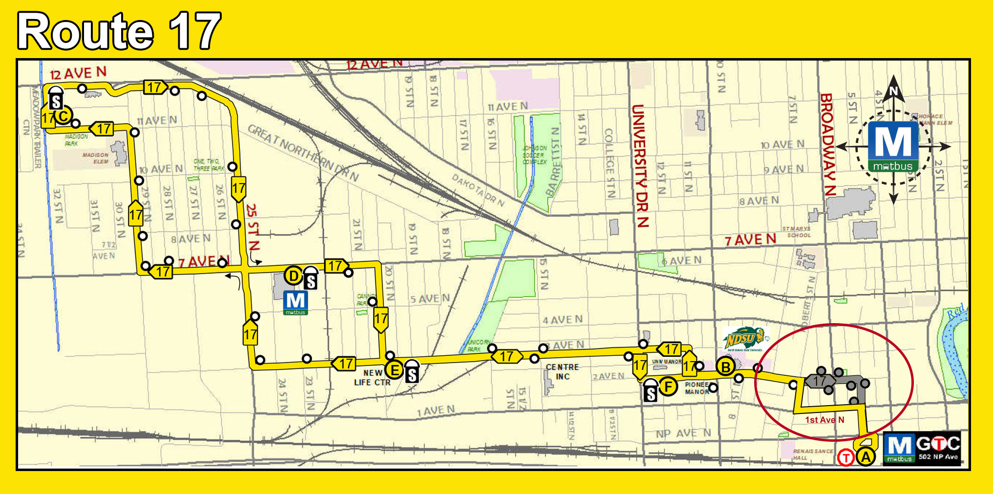 Outbound Detour: Route 17 will turn west on 1st Ave N, north on Roberts St., then west on 2nd Ave N, back on route.