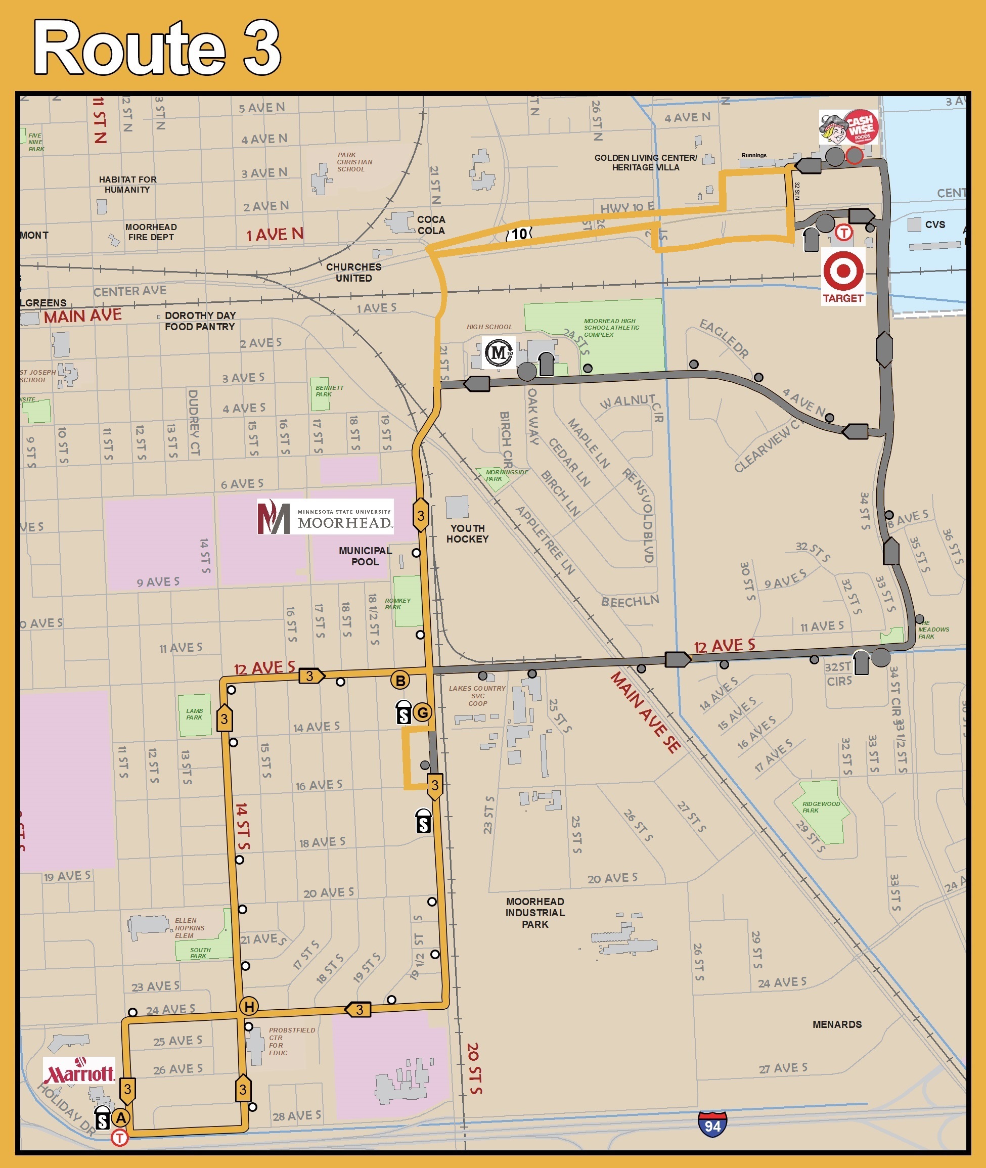 Beginning July 14, 34th Street in Moorhead will be closed between Hwy 10 and 4th Ave S. Because of this, Route 3 will have major detour affecting a large portion of the route.