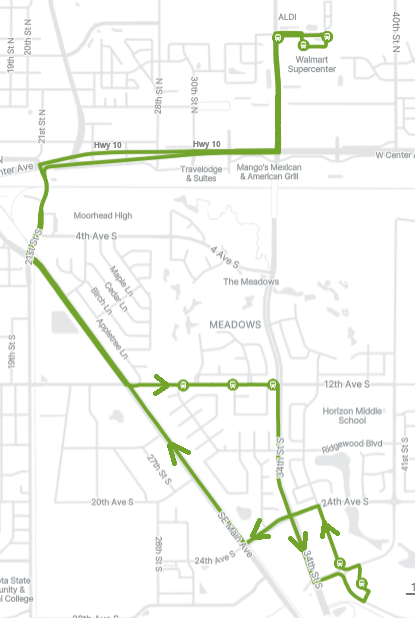 Route 9 will take Hwy 10 and SE Main to get to Walmart. Route 9 will not be able to access the Horizon Middle School area, and the Menards/Moorhead Learning Center area. Riders will be able to board Route 9 at existing Route 3 bus stops on 12th Ave. S.