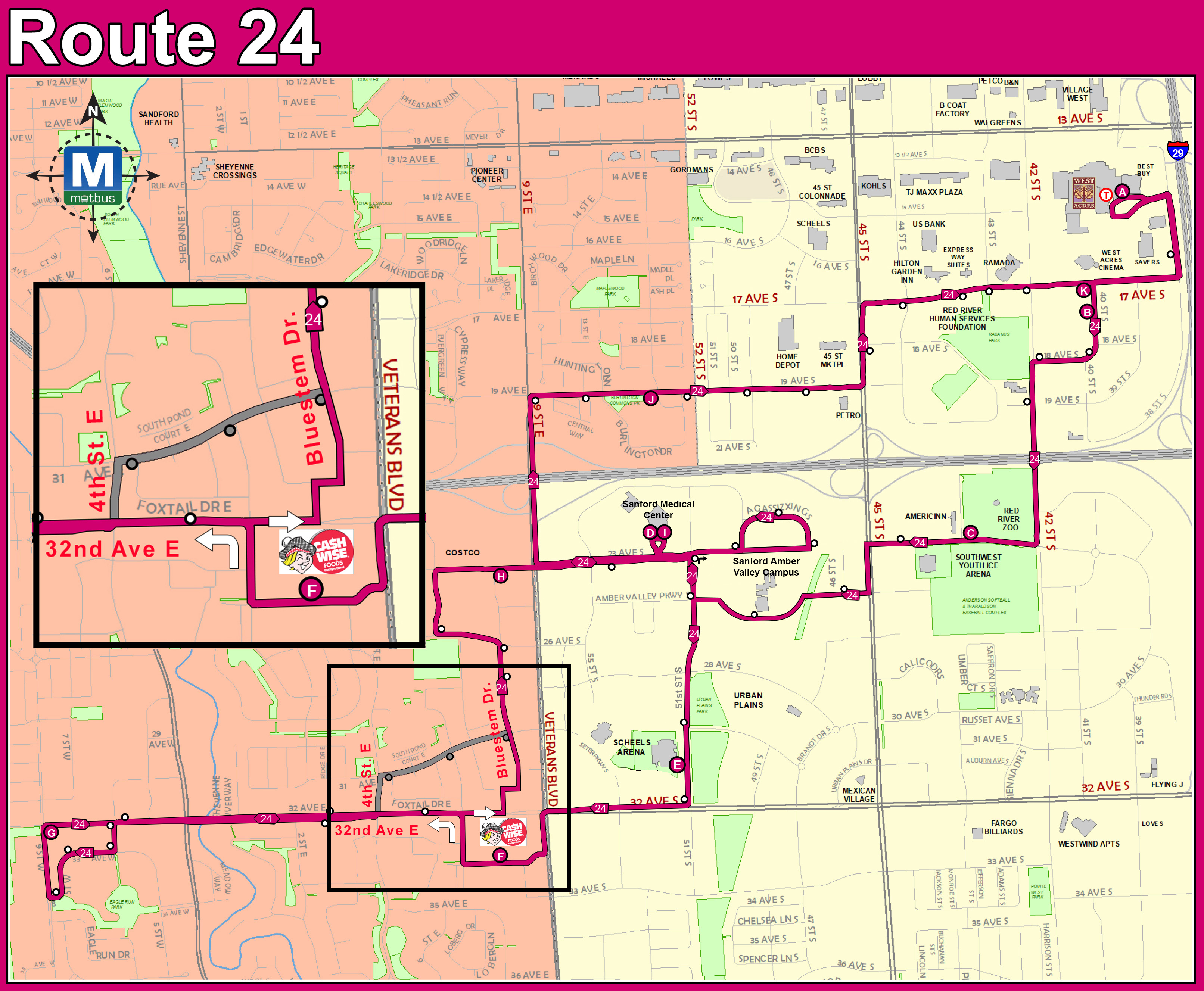 INBOUND DETOUR: Route 24 will continue east on 32nd Ave E, turn north onto Bluestem Dr., then continue back on route.